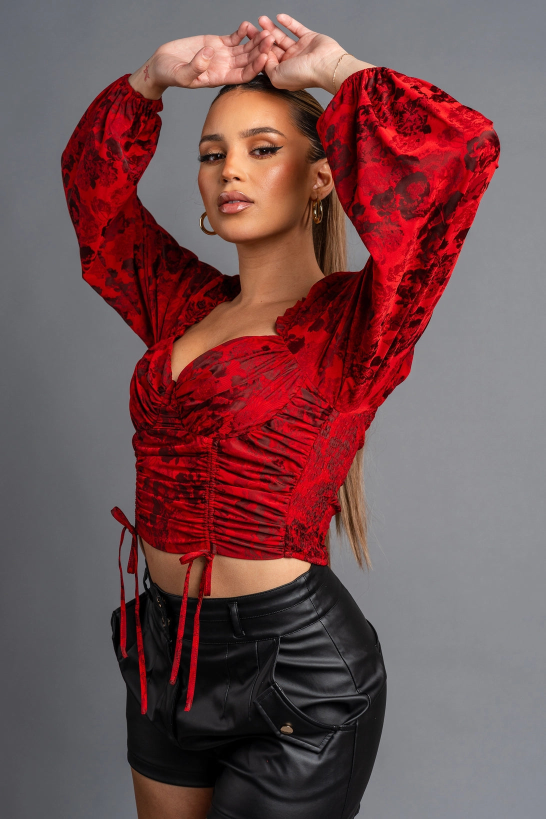 Romantic floral print sweetheart smocked back ruched drawstring peasant sleeves cropped top.